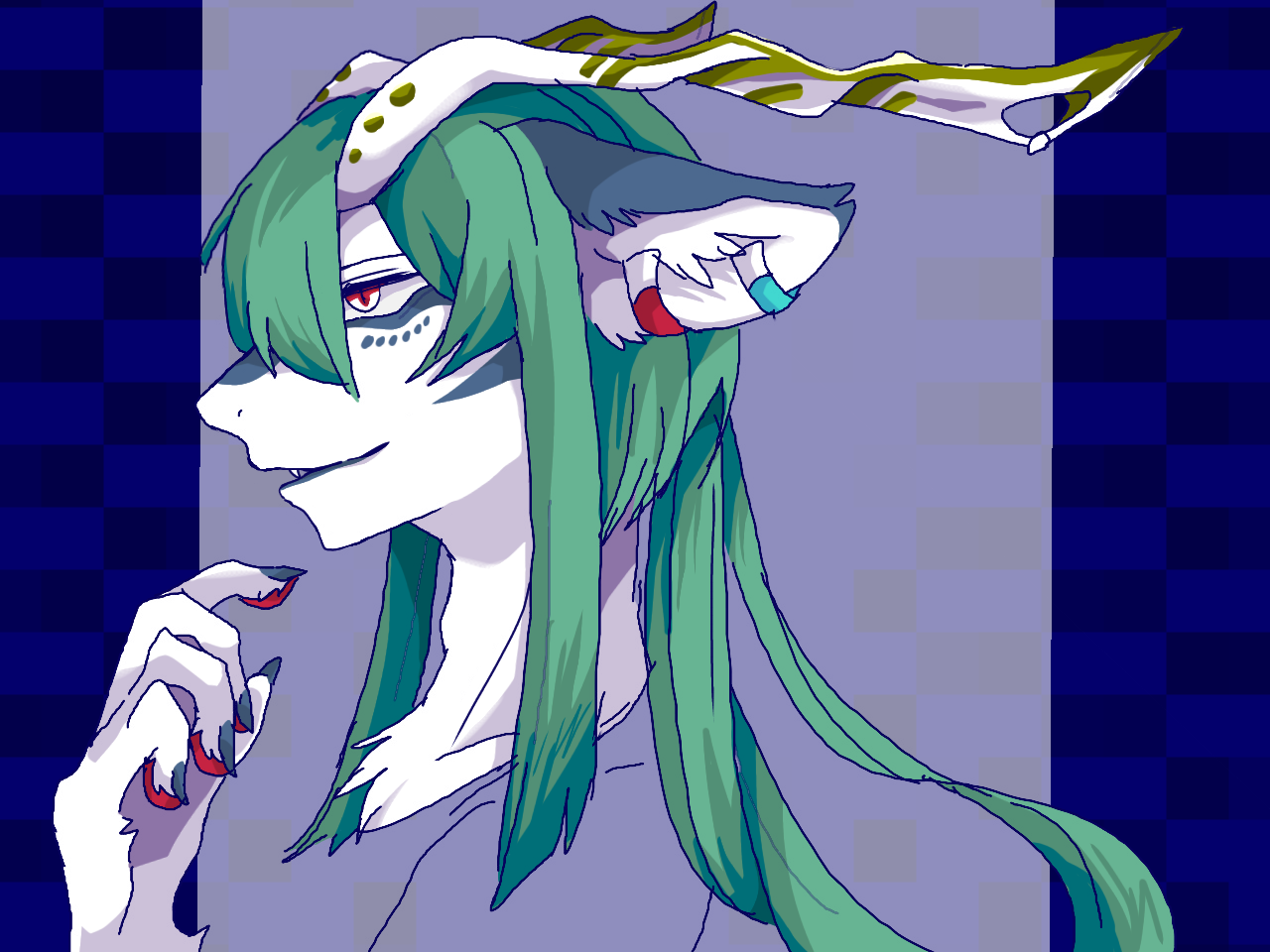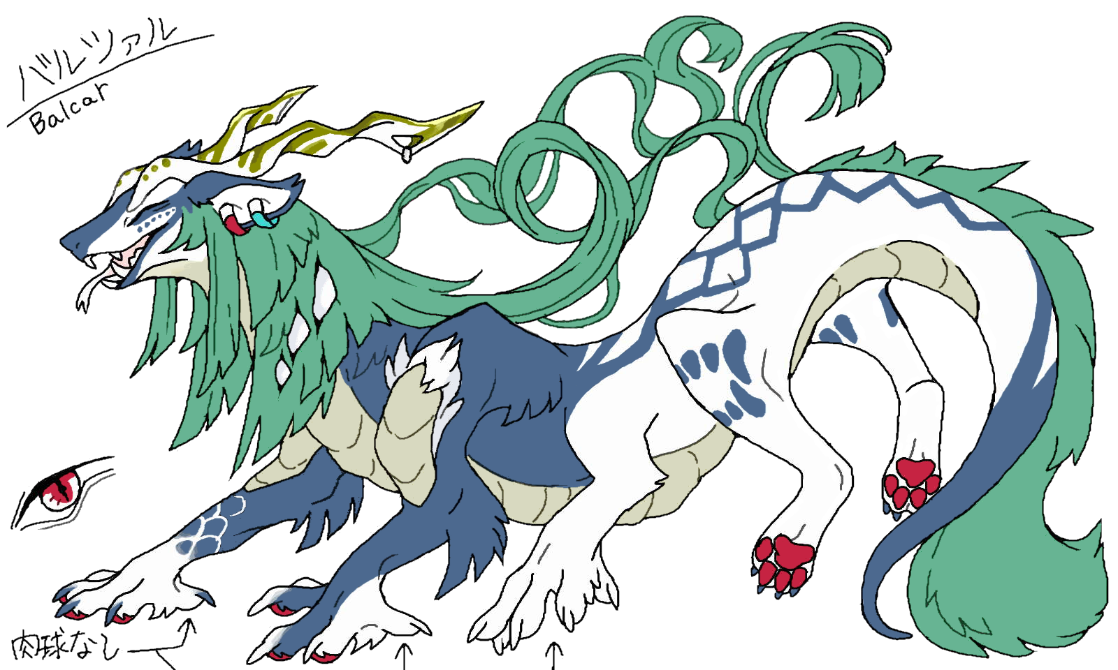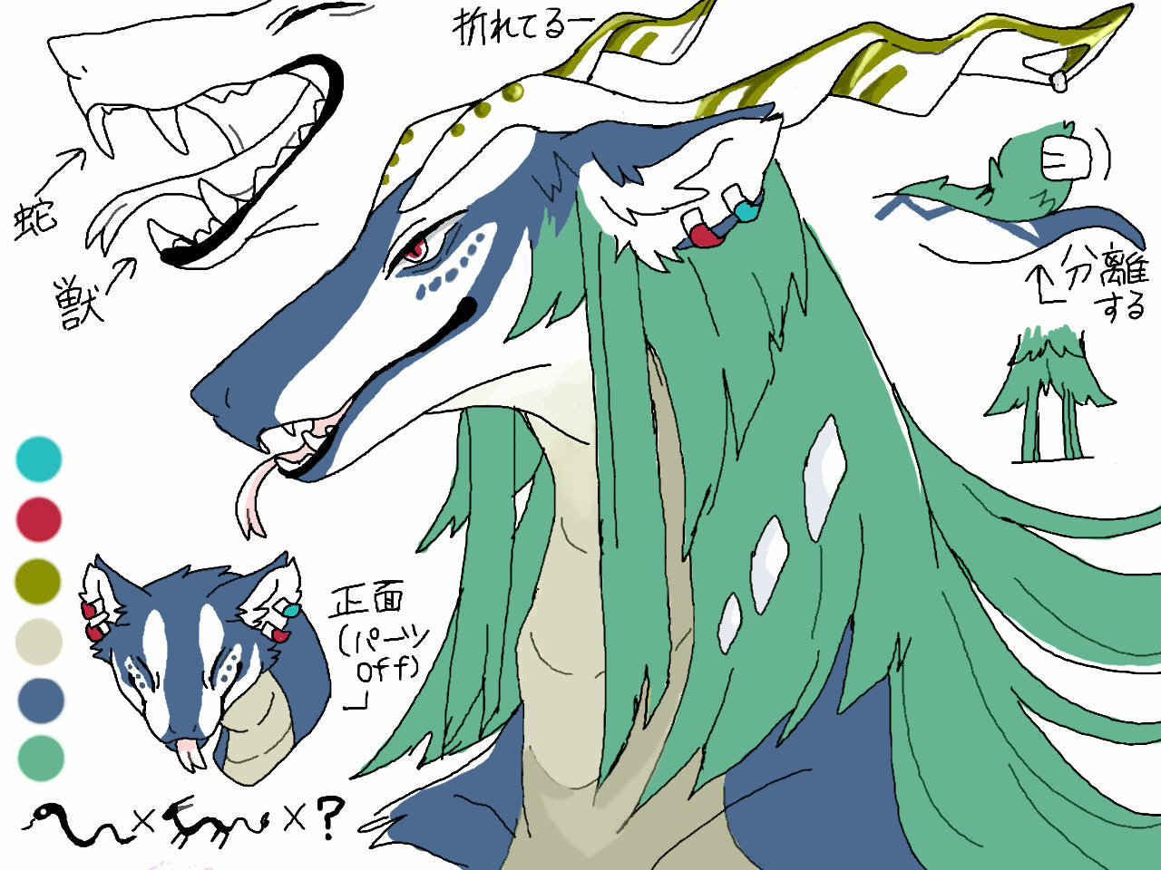 ―種族設定― 和名―ミモリカガチ(御守蛇)。幹のように太い身体から、英名ではTrunk snake―トランクスネークと呼ばれる。体長5~7m。 森林を住処とする獣類。食性は雑食。生肉、果実、昆虫の順に比率が高い。 陸棲であるが、稀に木を登り樹上に滞在する姿が確認されている。獲物を探すほか日光浴と休眠が目的。奇襲をメインに狩りをする。 容姿には様々な毛色があり、個体識別のし易い種族。長い身体と六本足、雄が有する角が共通の特徴。舌も蛇のように二又に分かれているが、匂いを感知する力は蛇に劣る。 蛇を思わせるものは容姿だけではなく、上顎の牙二本に出血毒を有している。が、これは幼獣期のみの特性であり成獣の有毒性は報告されていない。 一般的に毒の使用頻度の低下と共に毒性が失せ、最後に牙内部の穴が塞がる流れとなる。理由としては成獣となり体躯と筋力を得て、毒をメインの武器とする必要性が薄れたからだと思われる。 ―交流― 幼獣期から群れることはなく単独で行動し、他個体との接触は多くない。しかし、過去に二頭のミモリカガチが共に狩りをする姿が確認されており、協力、信頼関係を築く場合もあるとされる。知能が高い。 ミモリカガチによる負傷事案は0ではないが、適切な対処をすれば避けられる部類の獣。 雄は二対の角を持ち、生え変わることはなく一定の長さまで伸び続ける。大きさから形状、色に至るまで様々であり、その立派さで地位が決まる。 成長するにつれ各個体それぞれの模様が浮かび上がりとても美しい。 雄同士が鉢合わせした際は二頭が相対し頭部を掲げ、大きな円を描くように回る。一定の間隔で静止し睨み合い、『舞い』と呼ばれるそれは角のグレードを競うものである。 決着がつかない時は身体をぶつけ合うこともあるが、生死を掛けた喧嘩になることは繁殖期を除いてまずない。 互いの尾を追い掛けるような行動から、かつては神話におけるウロボロスと同一視した地域もあった。 普段は負傷を避ける傾向にあるが、本気の喧嘩では牙と爪を使い壮絶な争いを繰り広げる。 ―バルツァル― ミモリカガチの成獣。性別は雄、体長は平均的。 穏やかな気質を持つ友好的な性格。一般的な同種より優れた知能を有し、他種族の簡単な言葉やジェスチャーであれば理解することが出来る。 発する声は、基本的に高くも低くもない音域。お喋り。 右角が欠けており、雄同士の争いでは圧倒的に不利な個体。そのため生息域を追い出されたようで、ミモリカガチが滅多に確認されない地域に流れてきている。 周辺の生態系で地位が安定していることにより少々警戒心が薄い。平和ボケのミモリカガチ。 獣人族のある群れと交流を持っている。耳飾りはその証であり、名もそこから貰ったもの。"バルツァル"という単語は自身のことであると理解している。